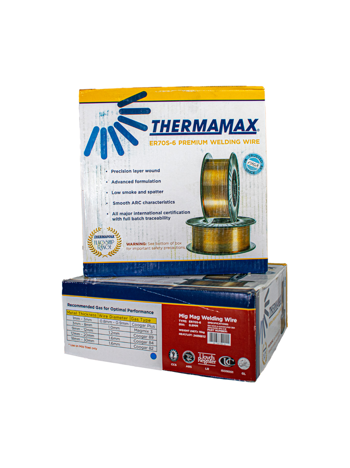 THERMAMAX ER70S-6 is a premium-quality copper-coated mild steel MIG welding wire engineered for superior performance in general fabrication and structural welding. Known for its excellent arc stability and low spatter levels, this wire provides smooth feedability and clean weld finishes across a variety of welding positions. Formulated with higher levels of deoxidizers such as manganese and silicon, THERMAMAX ER70S-6 is ideal for welding on dirty or rusty surfaces. It offers deep penetration and strong, consistent welds, making it suitable for mild and low-alloy steels in construction, automotive, shipbuilding, and heavy machinery applications.